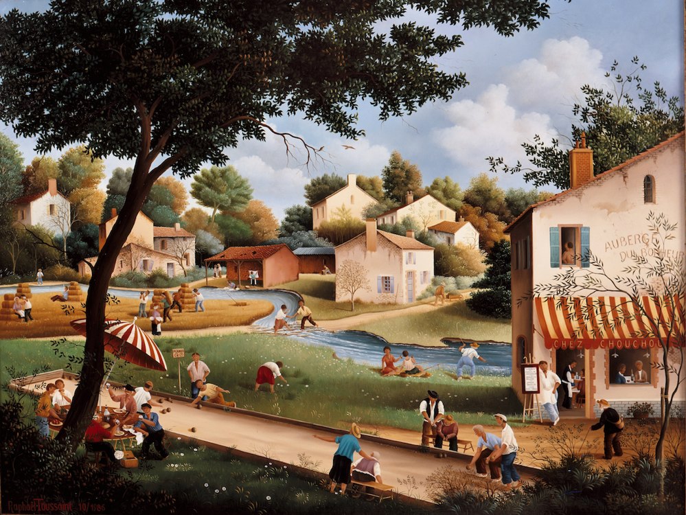 Ce 23 novembre 1986, après trois journées entières au grand Palais, c’est à quelques instants de la fermeture de l’exposition que je me sens transporté à la vue d’une peinture titrée « La partie de boules chez Chouchou» de Raphaël Toussaint.