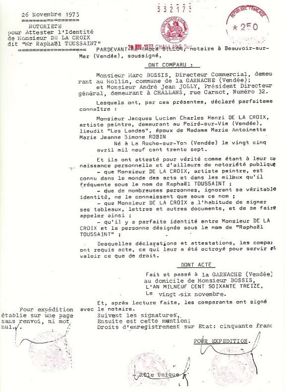 En 1964 apparaissent les premières toiles signées Raphaël Toussaint. Difficile de peindre en s’appelant Jacques de la Croix. Le 1er novembre 1963, jour de la fête de la Toussaint, il décide donc de changer son nom pour celui de Toussaint et, comme prénom il choisit Raphaël en hommage au peintre de la renaissance italienne.