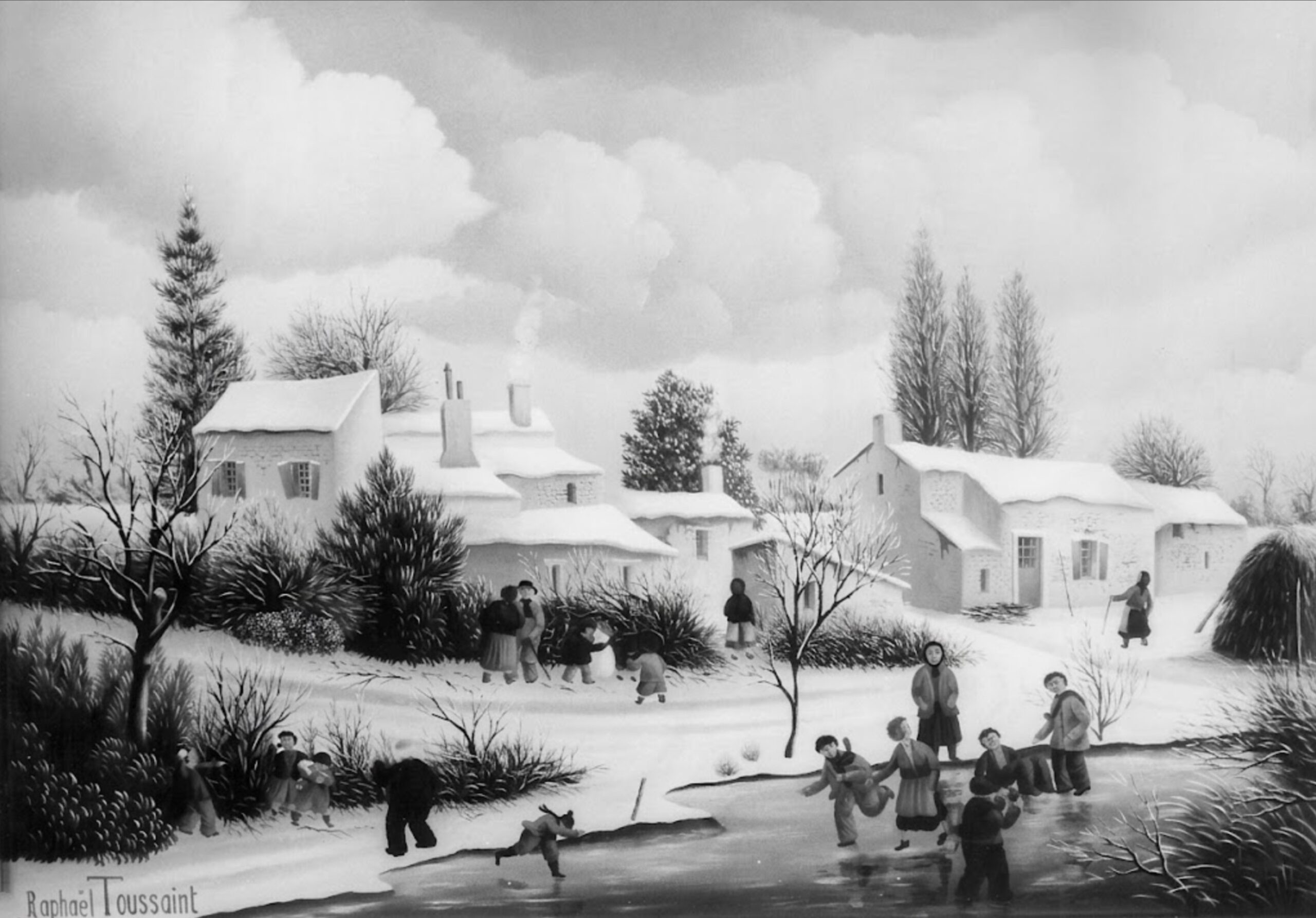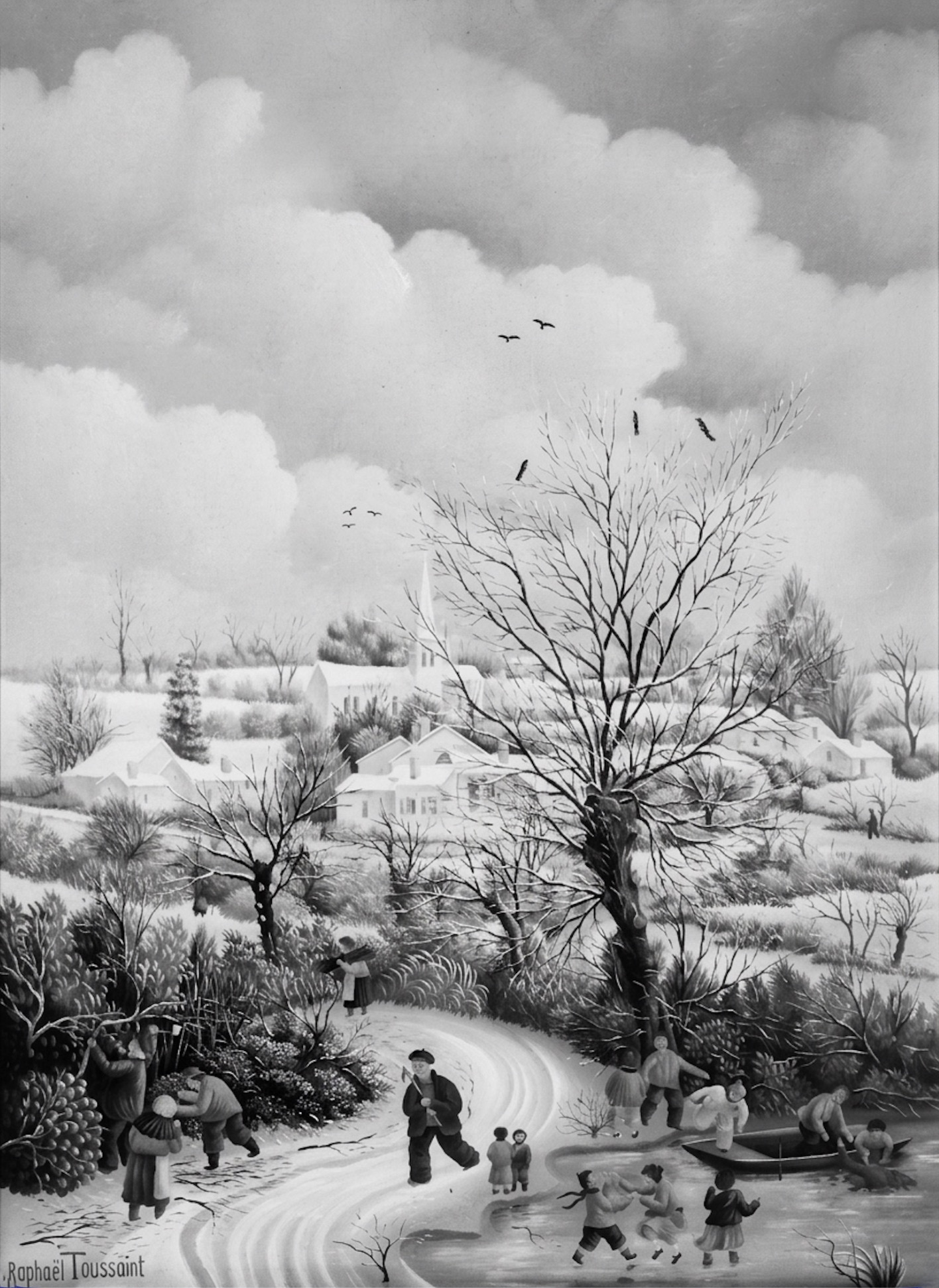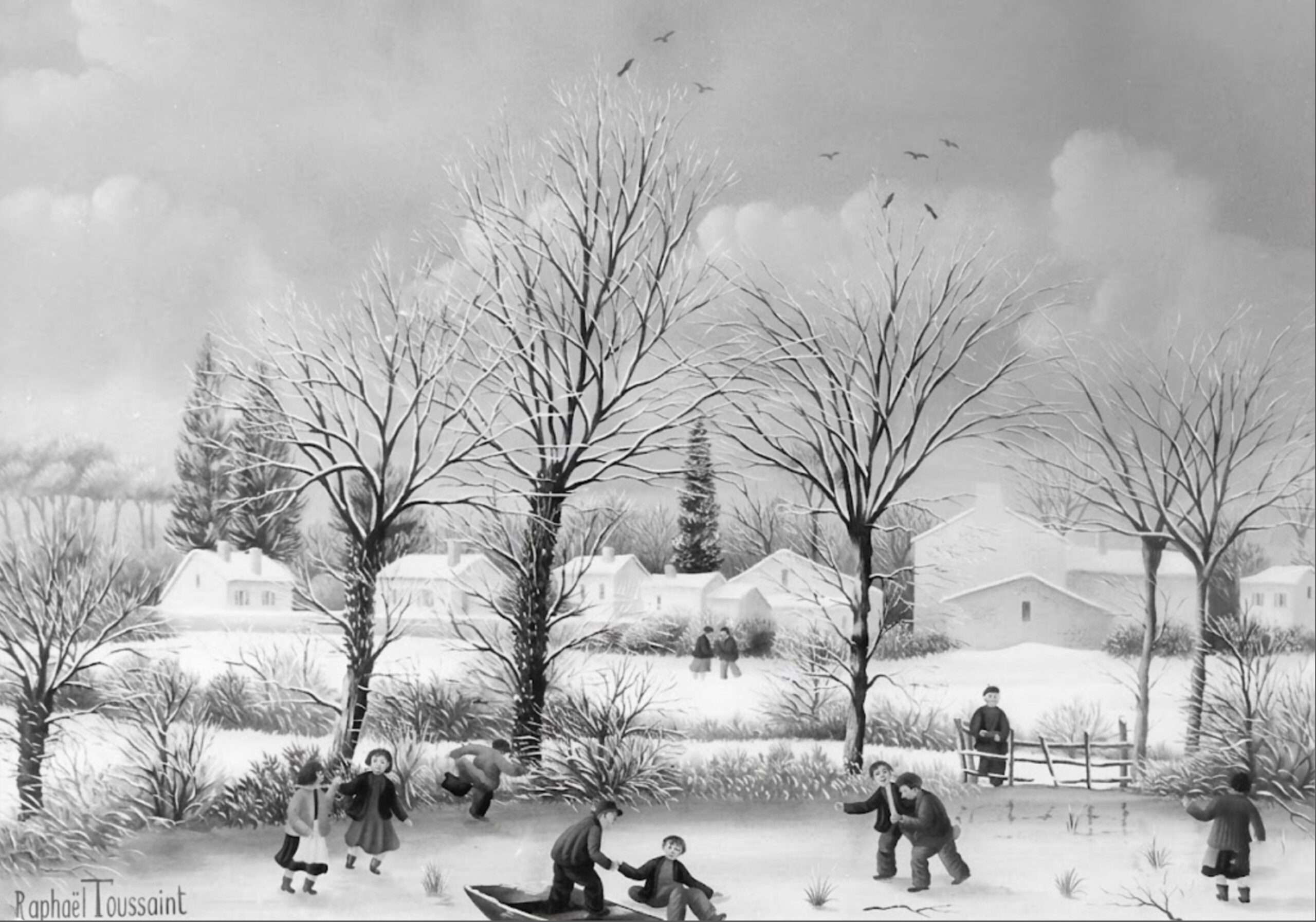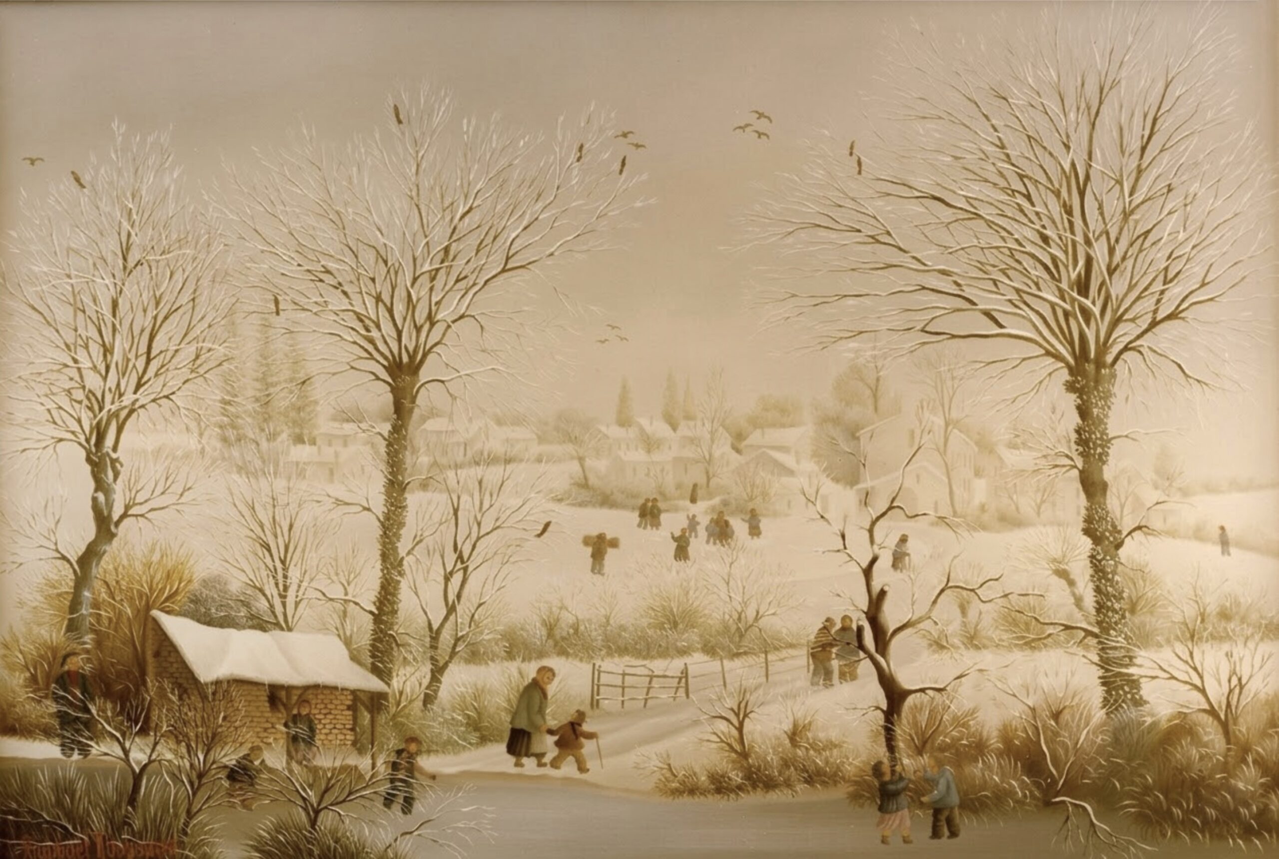 Village sous la neige- La course de traineaux-1979-33x46cm